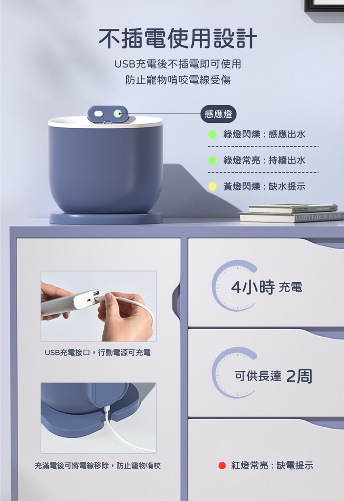 USB充電, 可無線使用, 防止寵物咬電線, 充電後可持續長達2周